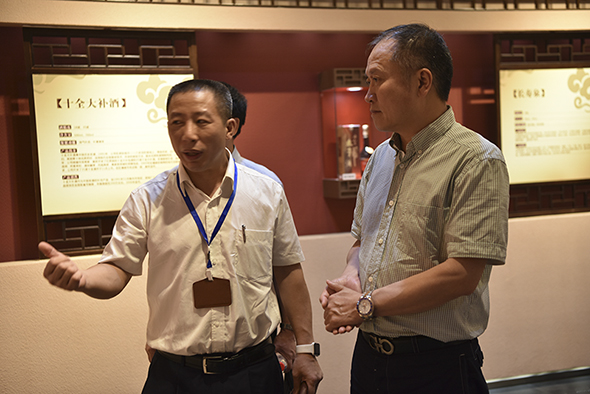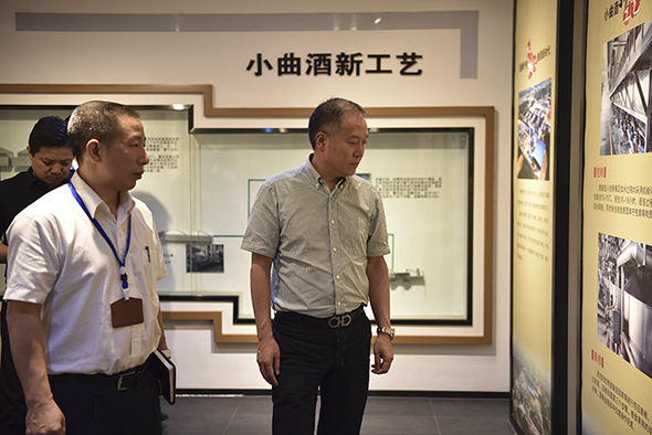 在勁牌展館內,接待人員講解了企業規模及發展歷程,并著重介紹了公司小曲釀造新工藝深山優質泉水泡糧,機械化生產糧食全程不沾地,廢糟循環再利用的全過程。在了解了勁牌釀造所用泉水富含多種礦物質,達到直接飲用水標準后,馬占軍董事長現場給予了“好水釀好酒”的贊許。