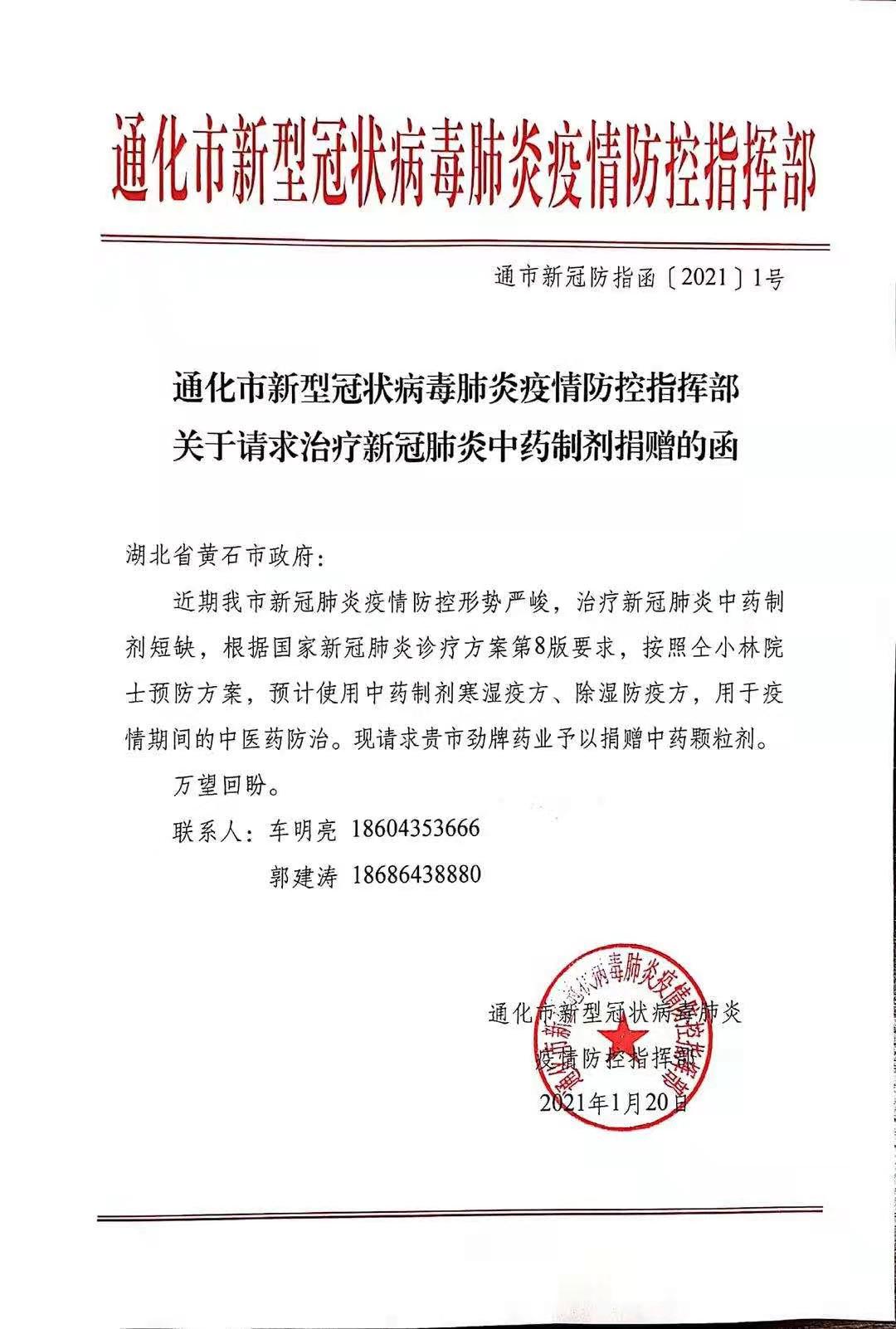 幾天前,勁牌持正堂還收到了來自吉林通化的求援。由于當地防疫中藥制劑的短缺,通化市新型冠狀病毒肺炎疫情防控指揮部向黃石市政府發函,請求勁牌持正堂藥業馳援一批寒濕疫方、除濕防疫方。收到消息的持正堂藥業以最快的速度組織防疫藥品,2月2日,也就是明天,這批愛心藥品即將踏上北上救援的旅途。
