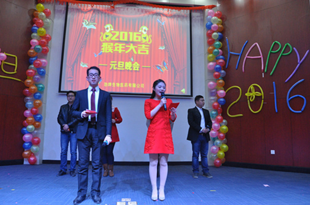 三羊乘舊去,金猴賀歲來。12月29日,生物醫藥公司在科技樓報告廳舉辦了2016年元旦晚會,生物醫藥公司領導、黃石經銷商福盛商貿有限公司領導、人力資源部部長、技術管理辦公室主任等領導應邀參加了此次活動。